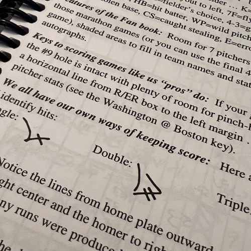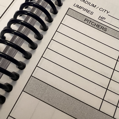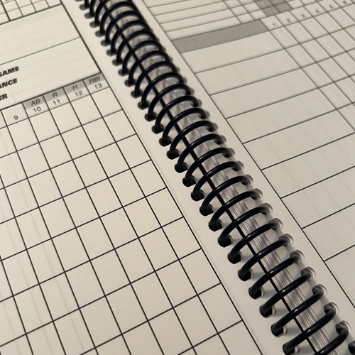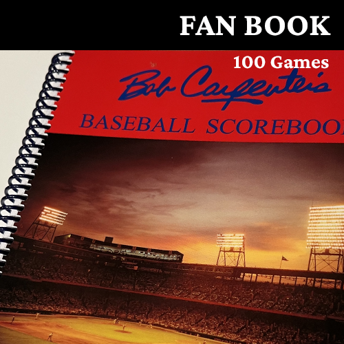 This book, with a capacity of 100 games, was designed in 1998 and is more compact for taking to the game, but it also has its own unique features. The Lineup grid is the same as the bigger books but, due to size limitations, only has room for 13 innings. Not available in the Fan version are the Bench and Bullpen boxes, plus the Defense section. The Fan book has an inning-by-inning scoreboard across the top of the page in lieu of the specialized team records; this is something a number of fans requested in their version. This book is 8 ½” x 7” opened to one page, and 8 ½” x 14” when completely open. The Washington Nationals version of the Fan book is identical to the regular Fan book, with the exception of several Nationals references on the Scorebook Key page and the NL/AL grid pages, plus a red cover featuring the Nationals’ official logo. The Washington scorebook is available only at the Nationals Park Team Store. The original St. Louis Fan book, designed in ’98 for Cardinals fans, is no longer available.